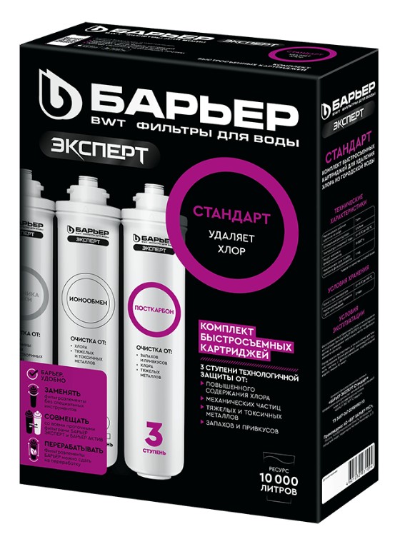 3."БАРЬЕР ЭКСПЕРТ ПостКарбон" - финишная очистка и кондиционирование, устранение неприятных привкусов и остаточного хлора.