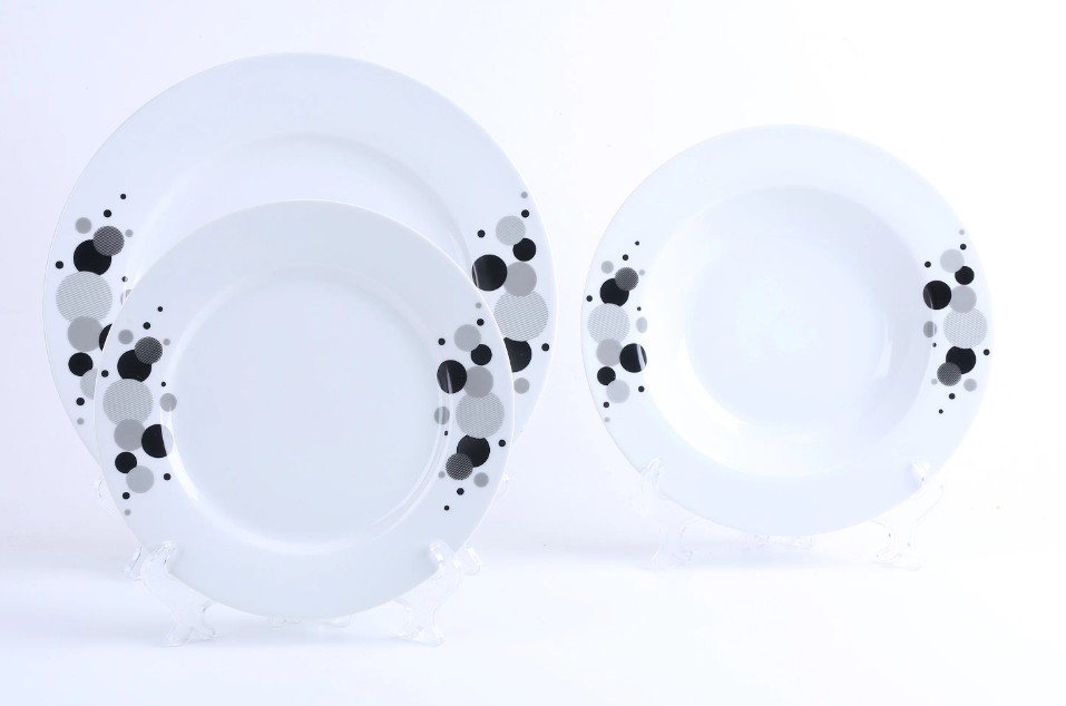 Сервиз обеденный Bekke rBK-9809 DAY & NIGHT, 18 предметов Сервиз из 18 предметов: тарелка обеденная 6 шт. (Ø 26,7 см) тарелка суповая 6 шт. (Ø 21,6 см) тарелка десертная 6 шт. (Ø 19,0 см) Материал: фарфор Подходит для чистки в посудомоечной машине Хара...