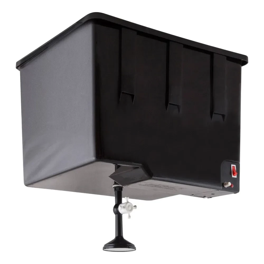Бак изготовлен из высококачественных материалов и предназначен для приема душевых процедур, как в составе уличной душевой кабинки, так и внутри помещения. Бак имеет возможность регулировать температуру нагрева до 55°С, снабжен сетевым выключателем, и индикацией включения ТЭНа. Корпус и крышка бака выполнены из черного пластика, что позволяет воде нагреваться от солнечных лучей.