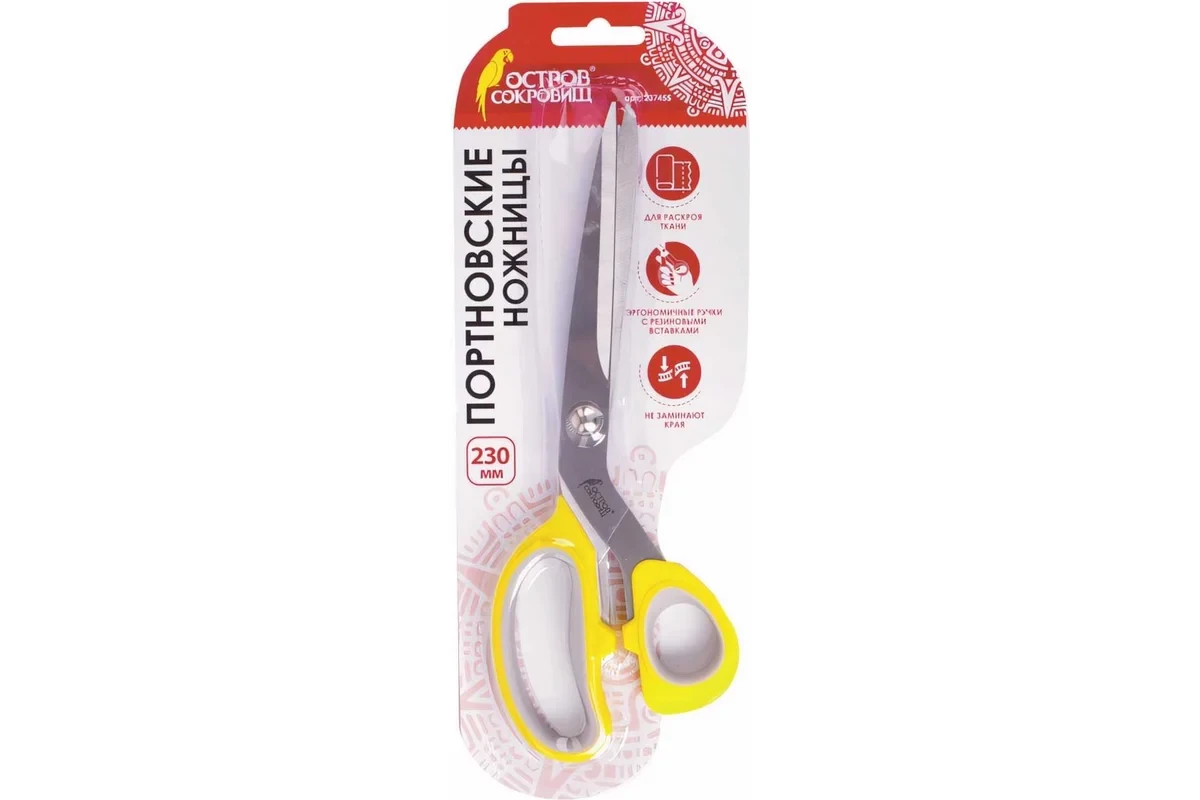 Портновские ножницы ОСТРОВ СОКРОВИЩ ПРЕМИУМ, 230 мм, желтые с резиновыми серыми вставками 237455 используются для раскроя ткани.