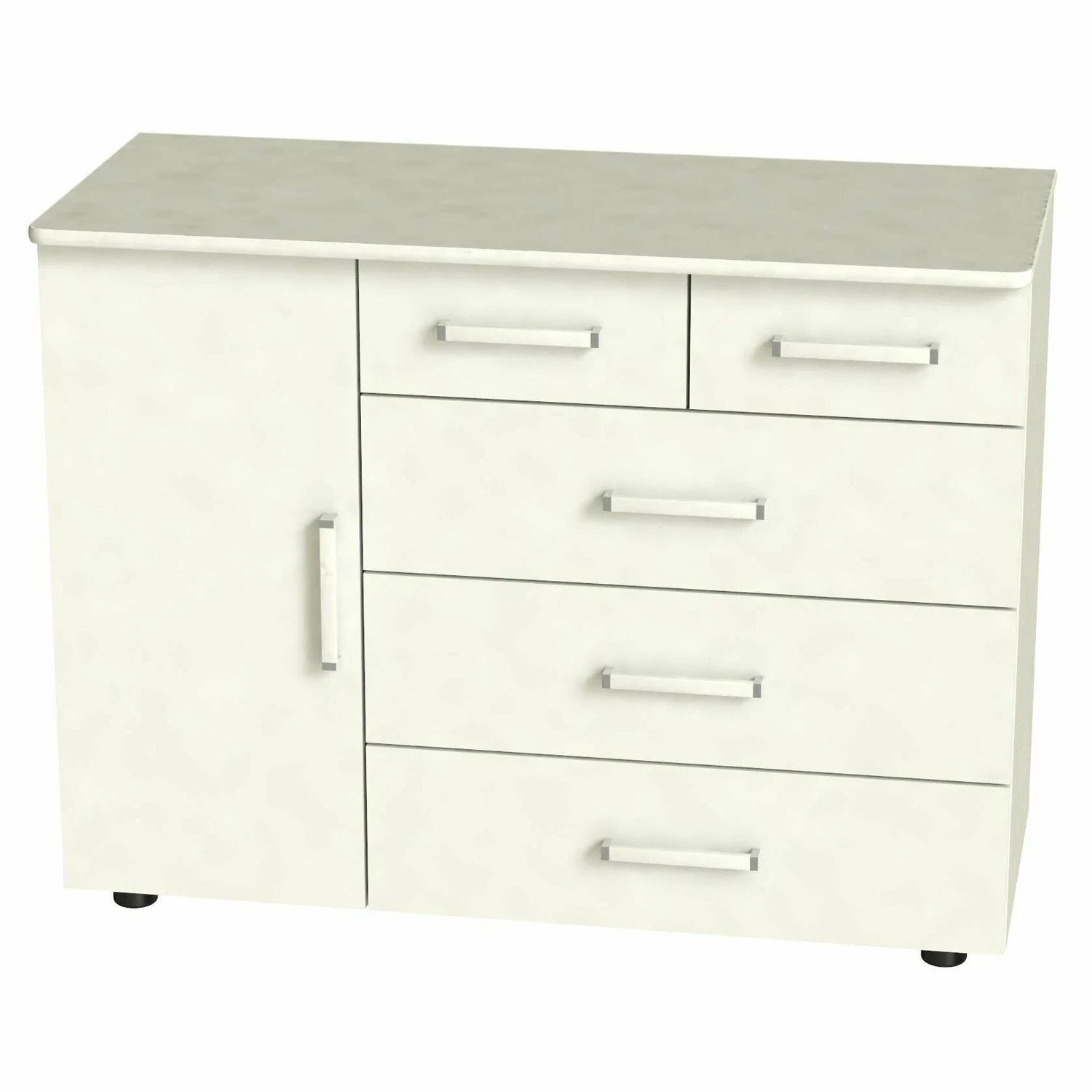 Комод выполнен из ламинированного ДСП высокого качества, что обеспечивает его прочность и долговечность.