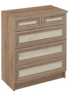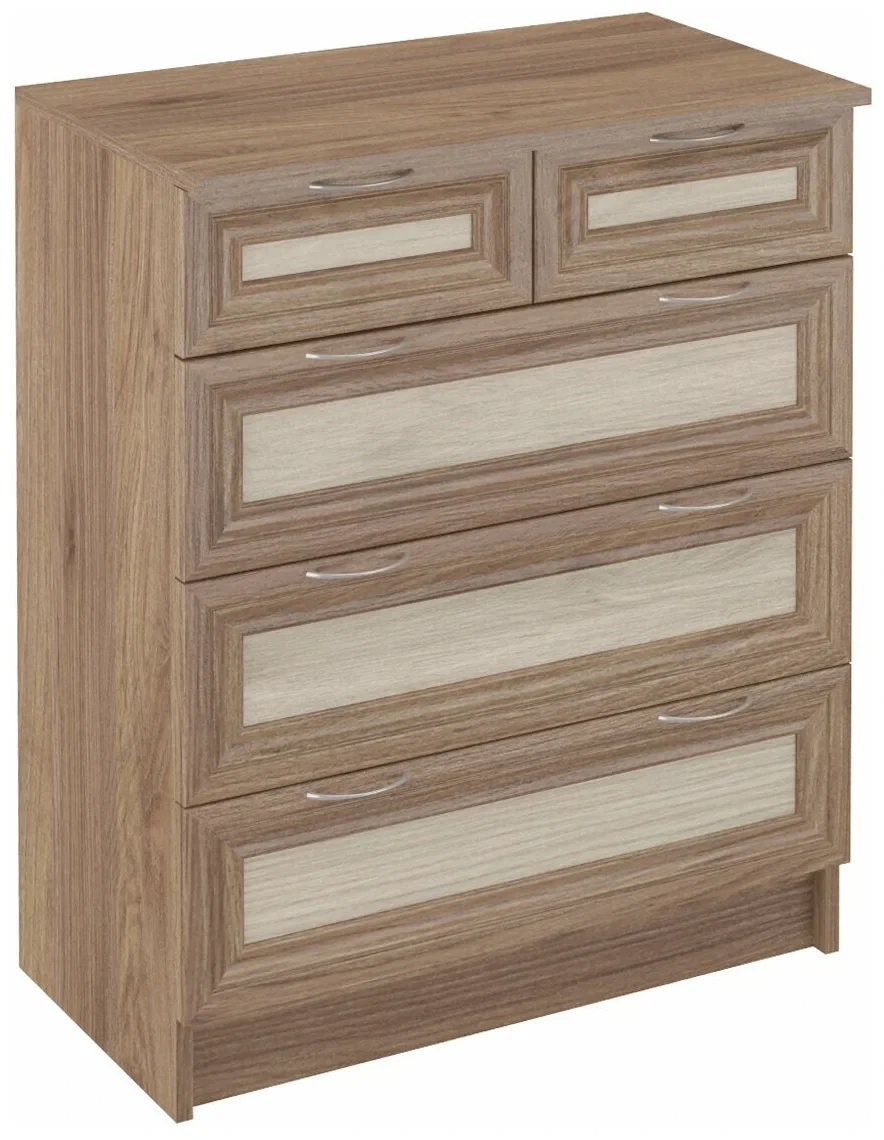 Корпус комода изготовлен из ламинированного ЛДСП, а фасад - из МДФ. Такое сочетание материалов обеспечивает прочность и долговечность изделия. Цвет корпуса - шимо темный, а фасад выполнен в светлых тонах - шимо светлый.