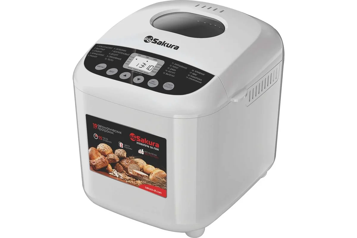Режимы: классический, быстрый, сладкий, французский, ржаной, запеканка, безглютеновый хлеб, десерт, смешивание, тесто, замешивание, кекс, джем, йогурт, выпечка, томление, квас, разморозка, обжаривание.