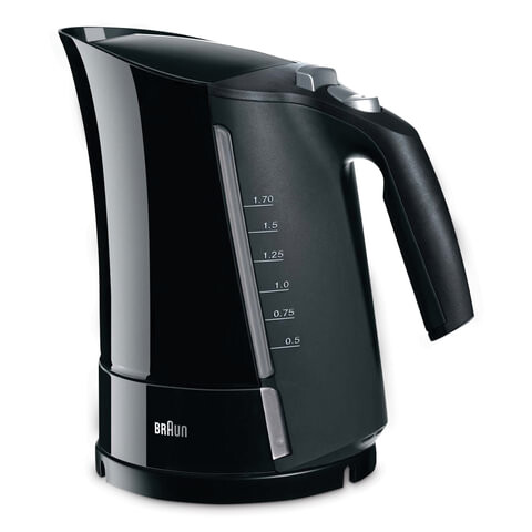 BRAUN WK-300 объемом 1,7 литра и мощностью 2200 Вт быстро вскипятит воду. Прибор оснащен закрытой нагревательной спиралью. В носике электроприбора имеется съемный фильтр. Крышка кувшина оснащена защитной блокировкой. Электрочайник оборудован многоуровневой системой автоотключения. Благодаря продуманному расположению кнопок управления и двойной шкале уровня заполнения, он будет одинаково удобен как для левшей, так и для правшей. В подставке имеется специальный отсек для шнура.
