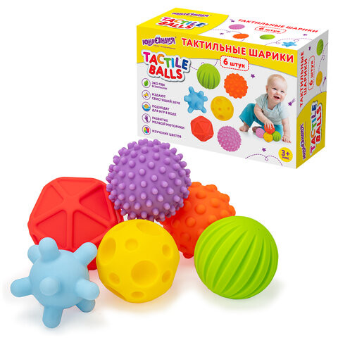 Современный вариант развивающих игр наиболее интересен детям дошкольного возраста. Ребенка старше 3 лет обязательно заинтересуют тактильные ощущения от касаний к ярким мячикам. В комплект входят 6 предметов разной формы и расцветки, цвета матовые, не бликуют на солнце. Мягкие, но упругие шарики выполнены из экологически чистого ПВХ, имеющего сертификат ЕАС для выпуска детских товаров. Отсутствует резкий запах, не страшно, если ребенок будет их грызть во время занятий.