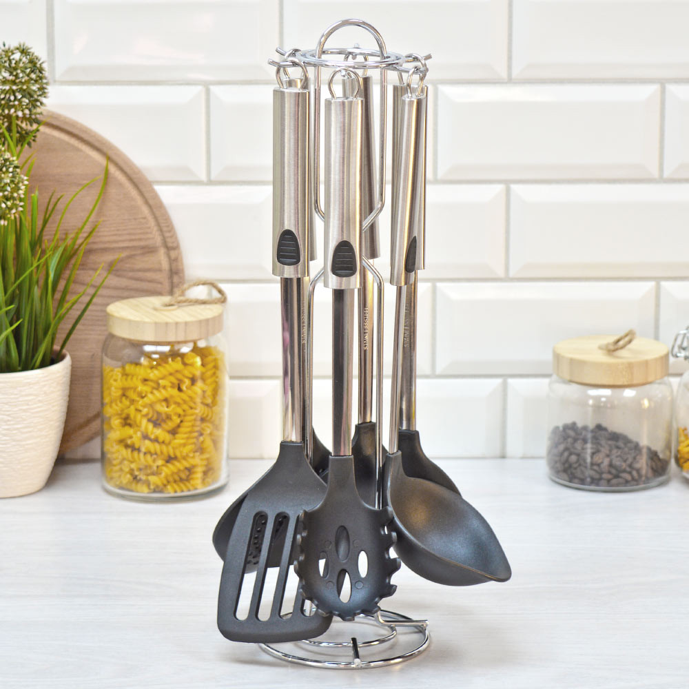 Набор кухонный 7 предметов BK-3252 Стильный и современный дизайн кухонных принадлежностей подойдет для любой кухни. Предметы из нейлона подходят для всех типов покрытий. Ручки оснащены петлями для подвешивания и подставкой, чтобы можно было поставить н...