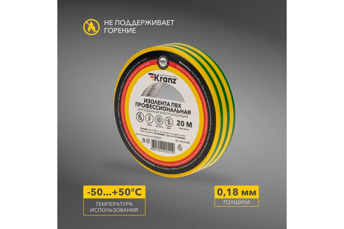 Технические характеристики изоленты KRANZ ПВХ 19 мм х 20 м, 0.18 мм, желто-зеленая