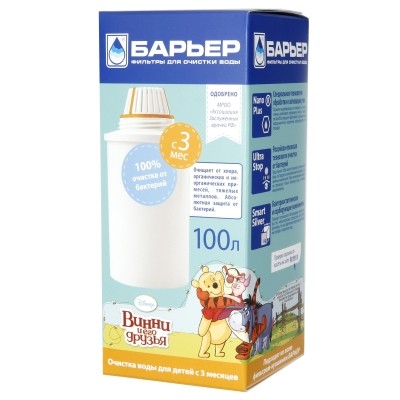 Детская. Кассета фильтрующая "Винни и его друзья" предназначена для доочистки питьевой водопроводной воды от хлора, органических и неорганических примесей для детей с 3 месяцев. Гарантирует абсолютную очистку от бактерий. Чистая питьевая вода необходима для роста и развития ребенка, она способствует укреплению иммунитета. Вода, очищенная от бактерий и не содержащая ионы серебра, безопасна для питья и приготовления детских смесей.