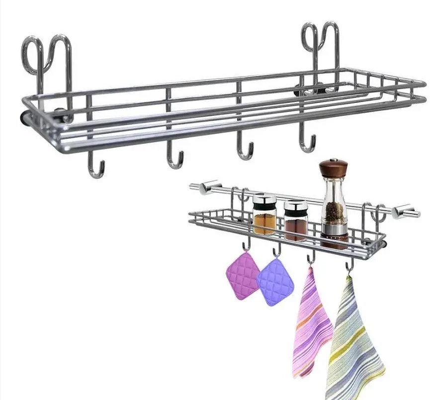 Полка навесная на рейлинг для баночек со специями, пекарскими порошками, солонок и перечниц. Крючки для подвешивания кухонной утвари, прихваток или полотенец. Материал: хромированная сталь Ширина-250 мм. Глубина- 95 мм. Высота-100 мм.