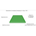 Сотовый поликарбонат владеет высокой устойчивостью к воздействиям температур, его показатели можно ограничить радиусом от -50 до +120 градусов. А так же сам лист защищен от разрушения ультрафиолетовыми лучами покрытием, нанесенным на поверхность листа (об этом Вам расскажет цветная сторона транспортировочной пленки, на которой указаны все показатели, а так же марка листа).